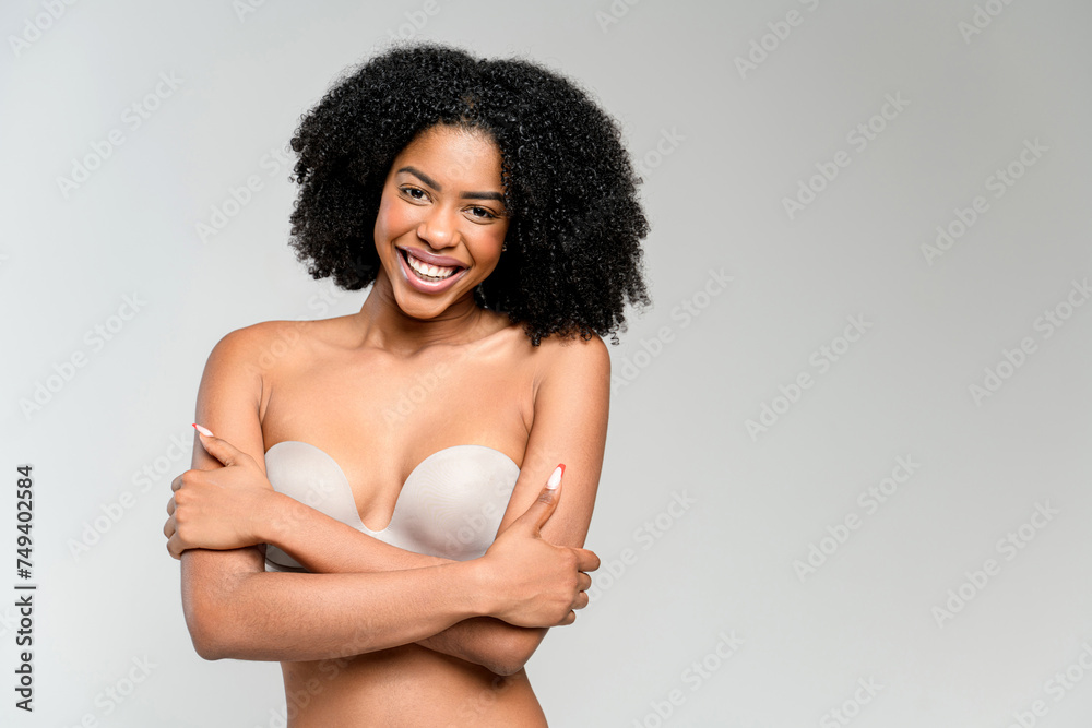 A radiant African-American woman stands with her arms crossed over her chest, sporting a backless adhesive bra, conveying a message of confidence and comfort in one's skin.