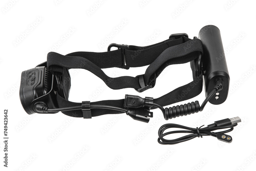 Modern LED headlamp. A flashlight for when you need your hands free. Isolate on a white back