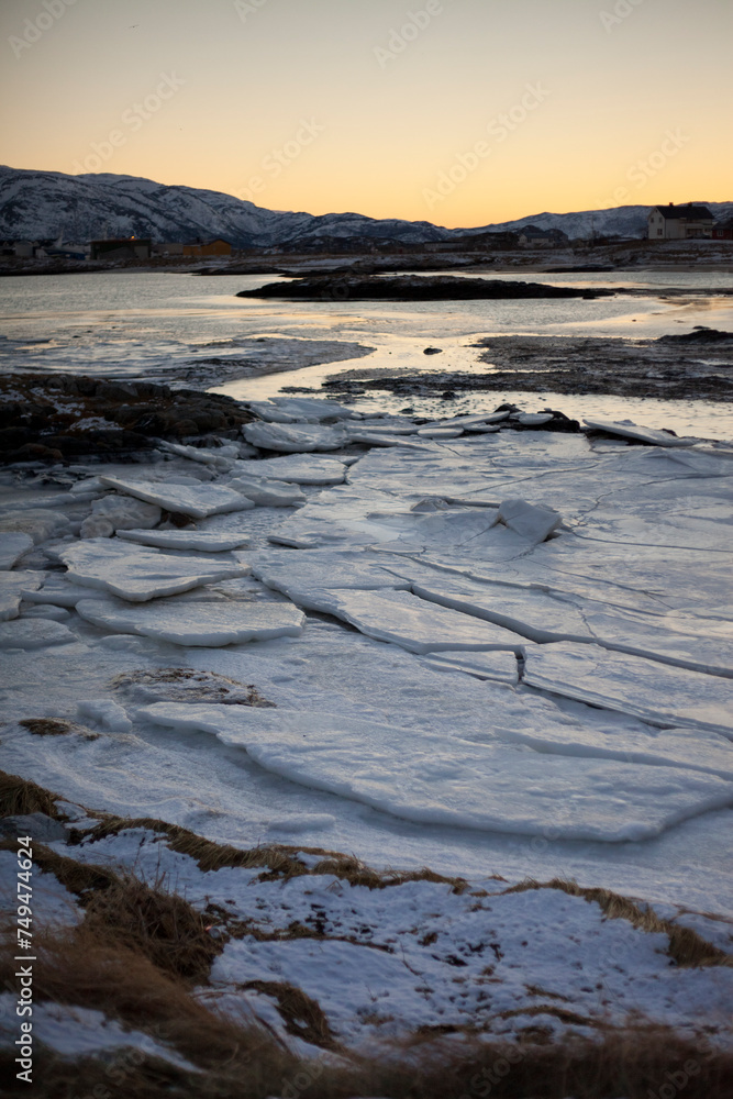 Frozen sea, with yellow hue of winter sun, Sommaroy near Tromso, northern Norway