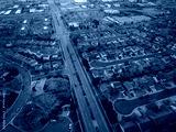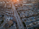 winter sunrise over a street with morning traffic and residential area of Fort Collins in northern Colorado, aerial view