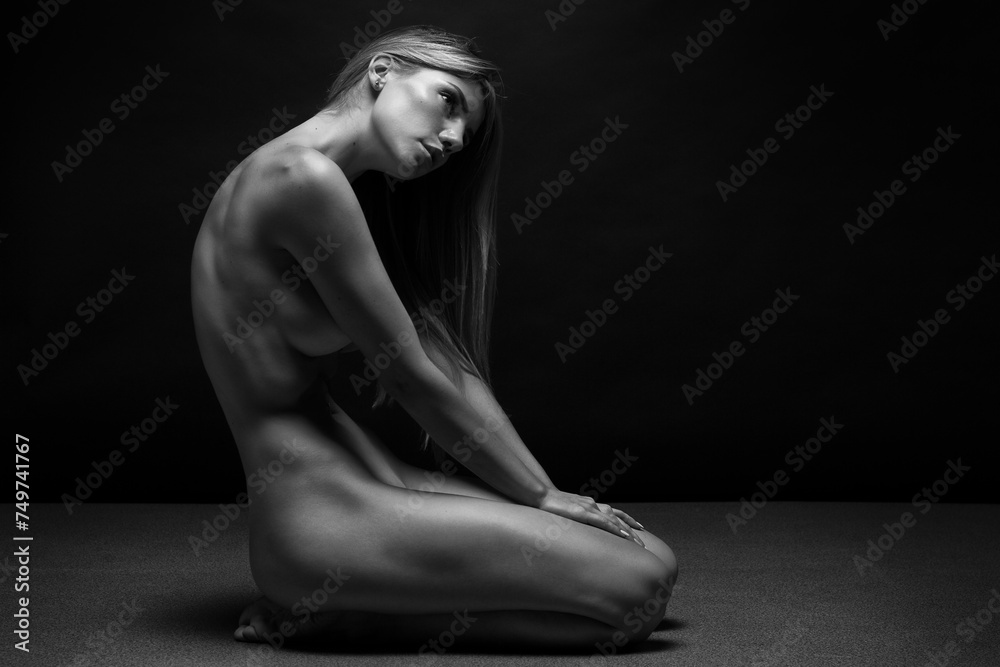 Abstract fine-art portrait. Black and white photo of nude beautiful woman. Female body on black background.