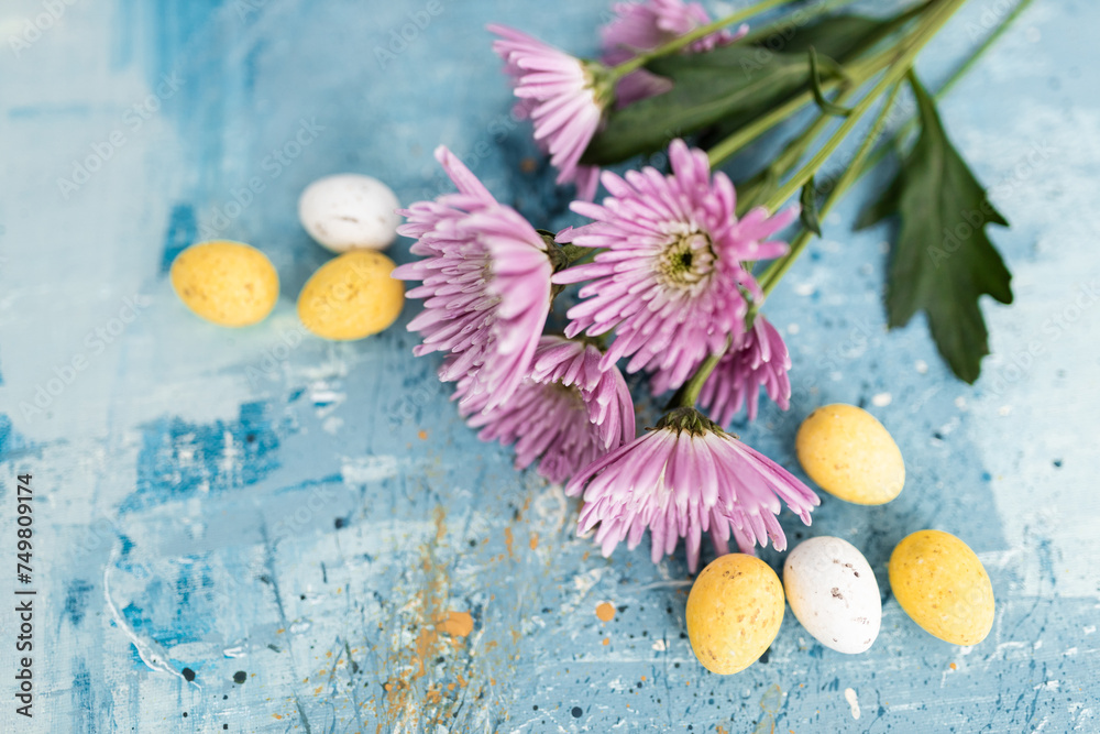 Pink flowers and yellow and white colored easter eggs on a blue picturesque oil painting background close up. Spring Mockups with pink Gerbers. Layout. Easter pastel background
