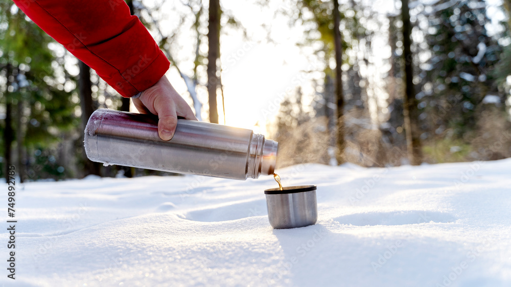 a tourist pours hot tea from a thermos in a snowy forest