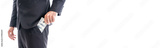Businessman in a suit discreetly holding dollar cash, symbolizing bribery, corruption, or undercover payment.