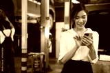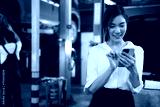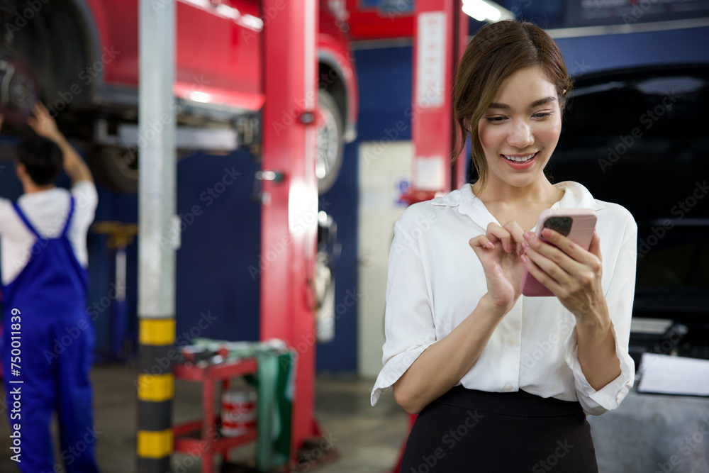 businesswoman or customer chatting and messaging on smartphone in automobile repair shop