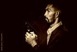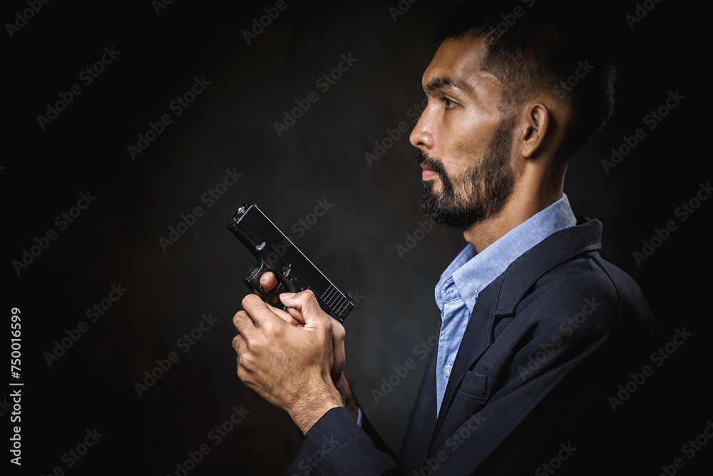 A bearded young man wearing a suit holding a pistol. Male mafia assassin or intelligence agent holds a gun on black background.