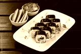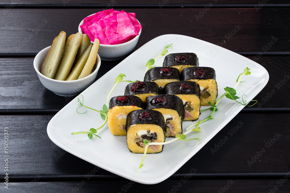 Lunch salad in the form of rolls from tuna, mushroom, boiled potatoes, onion with pickled cucumbers and cabbage.