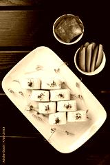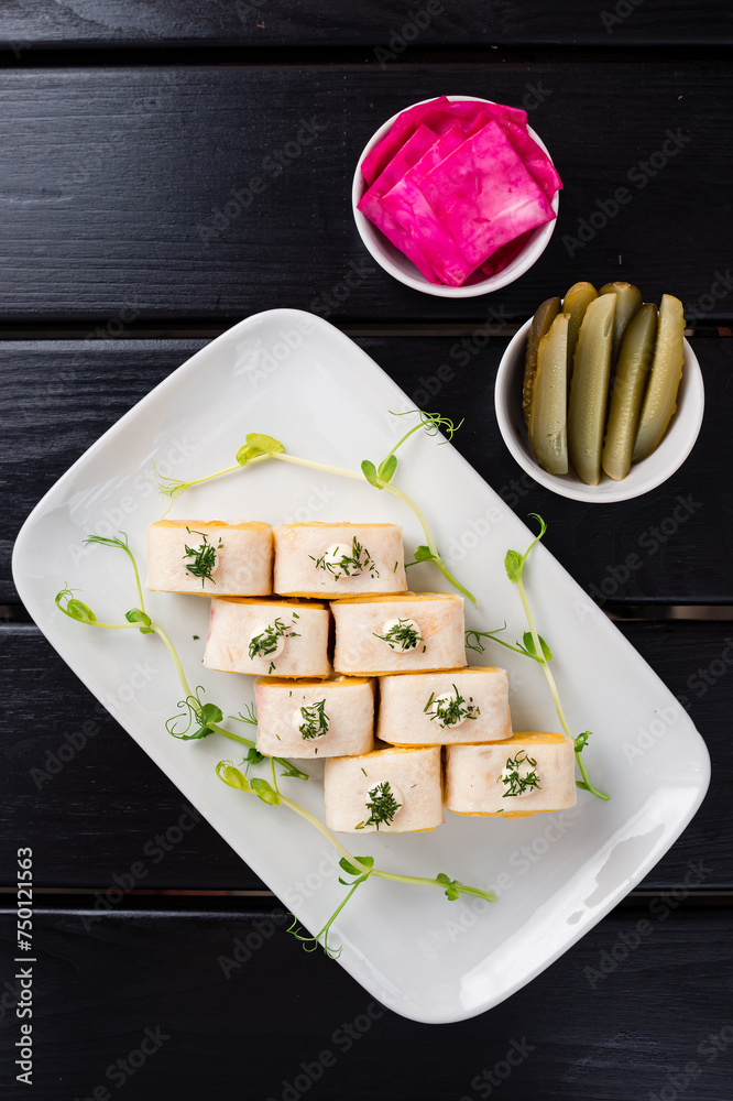 Salad in the form of rolls from boiled potatoes, onion, cream cheese with pickled cucumbers and cabbage.