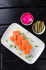 Salad in the form of rolls from salmon, boiled potatoes, cucumber, cream cheese with pickled cucumbers and cabbage.