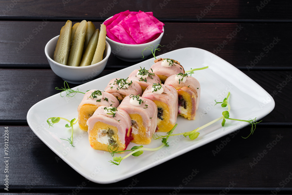 Set of salad in the form of rolls from bacon, boiled potatoes, onion, cream cheese with pickled cucumbers and cabbage.