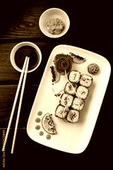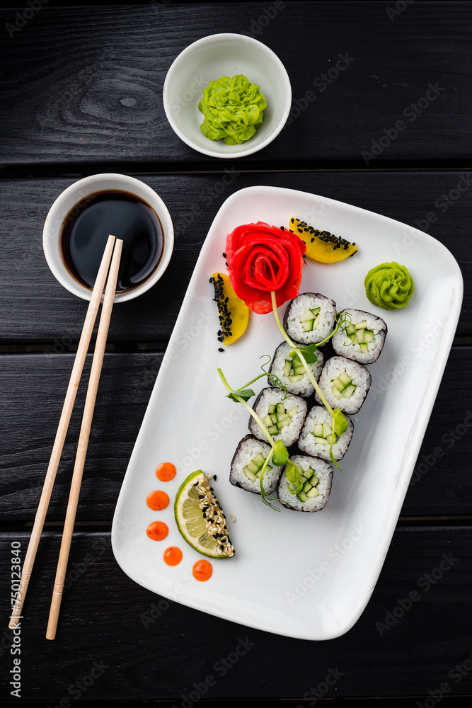 Set of sushi rolls from cucumber, rice and nori with wasabi, ginger and soy sauce.
