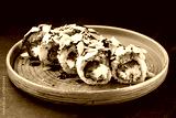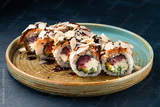 Lunch sushi rolls with tuna, cream cheese, cucumber, almonds, sesame seeds and barbecue sauce.