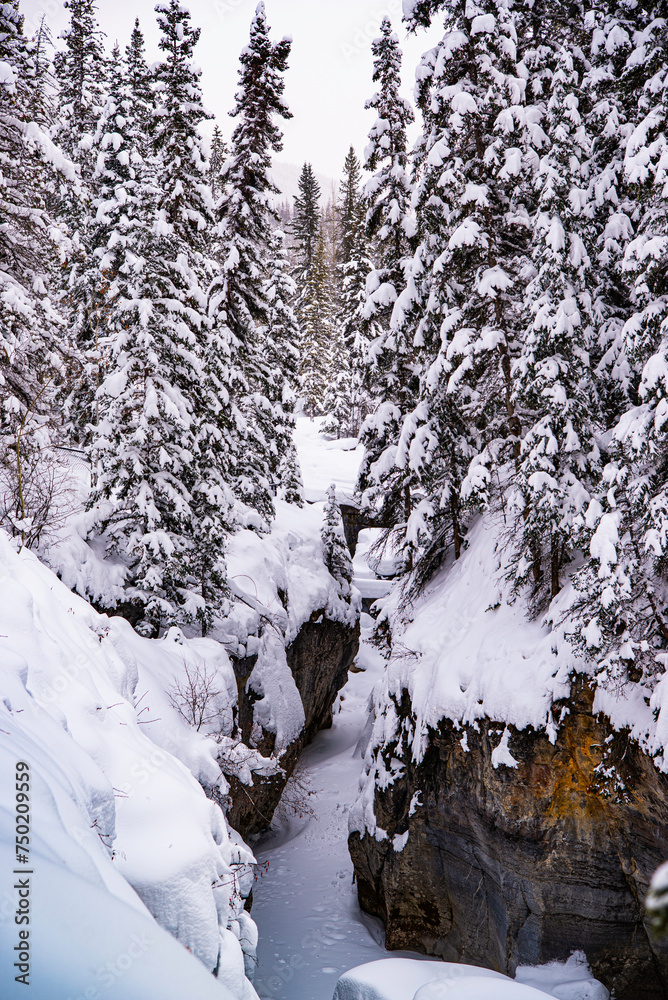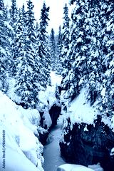 Maligne Canyon, Canada - Dec. 25 2021: Creek frozen in Maligne Canyon surounded by forest