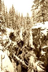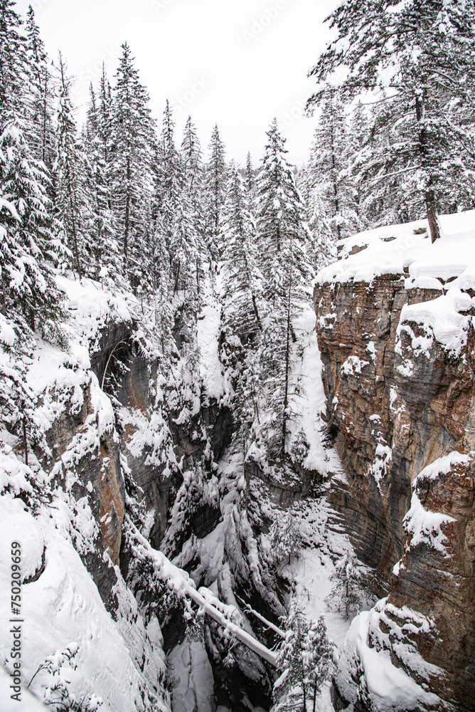 Maligne Canyon, Canada - Dec. 25 2021: Creek frozen in Maligne Canyon surounded by forest