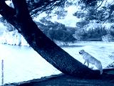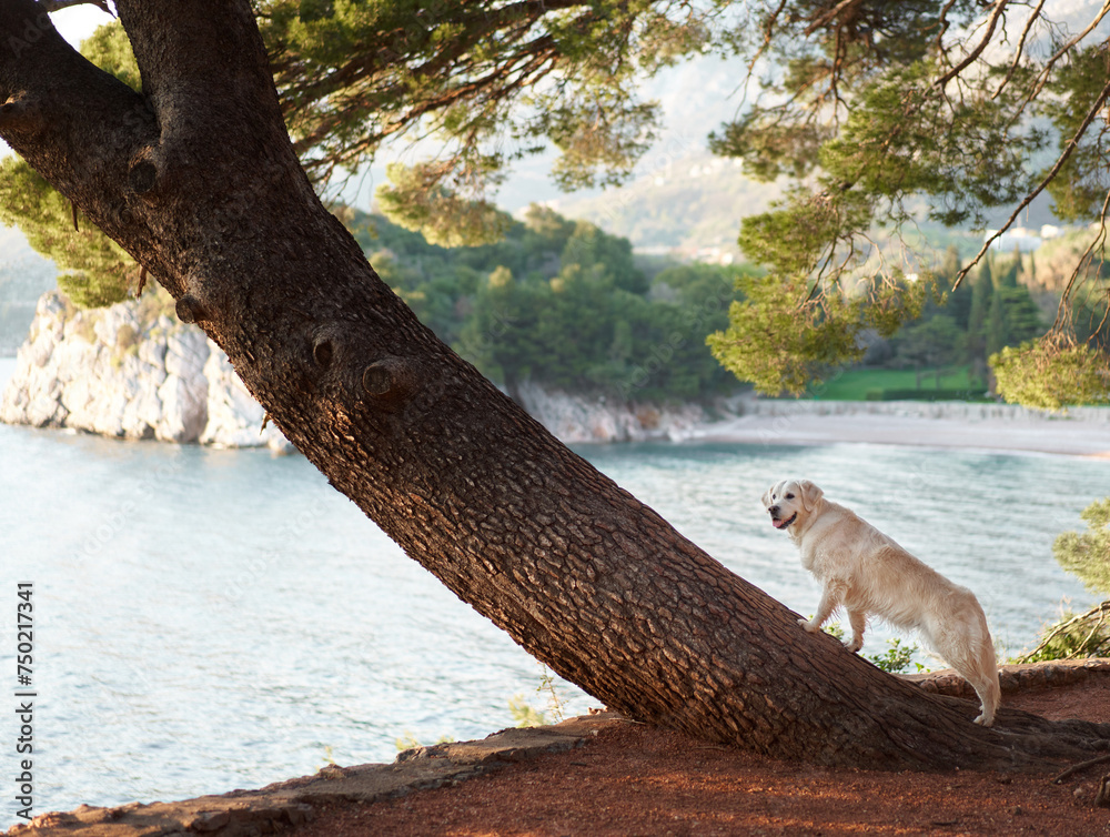 A cream-colored Golden Retriever dog stands on a slanting tree trunk, overlooking a tranquil cove with a forested coastline in the backdrop