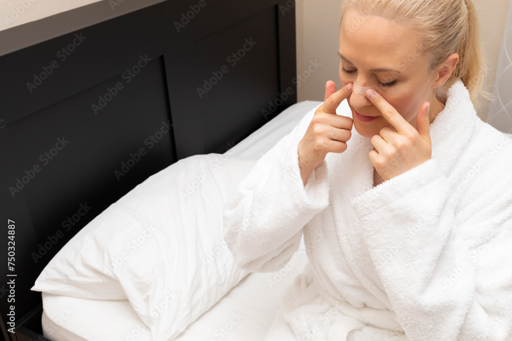 White Woman Applies Nasal Strip on Nose Before Going To Bed, Sitting on Bed. Stop Drug-free, Snoring, Sleeping Apnea Solution. Copy Space. Adhesive Bandage For Better Healthy Breathing. Horizontal.