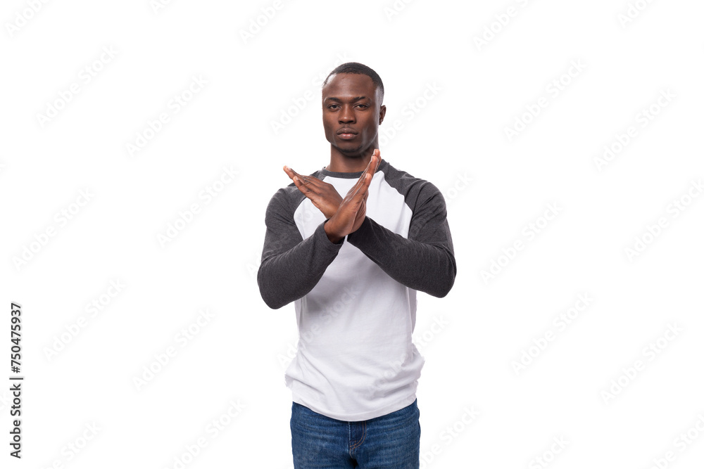 a young American man with a short haircut is dressed in a casual jacket with his arms crossed in front of him