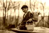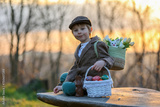 Beautiful stylish toddler child, boy, playing with Easter decoration in the park, springtime