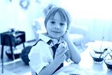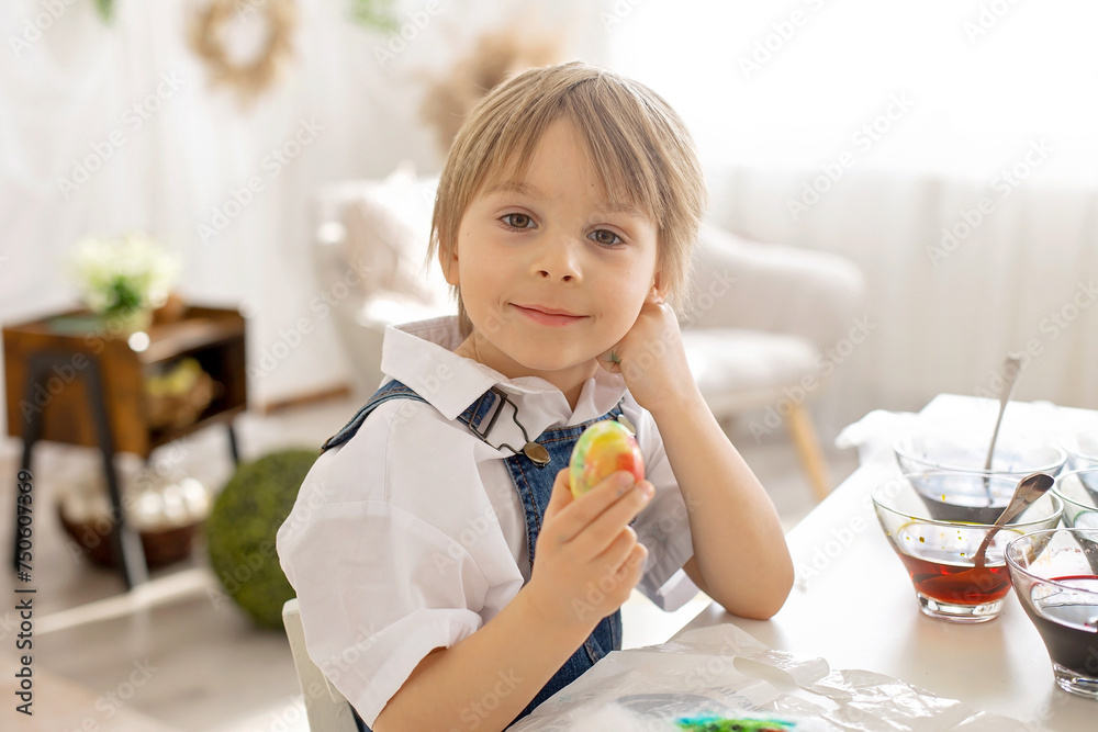 Happy childen, siblings, coloring eggs for Easter at home, sunny room