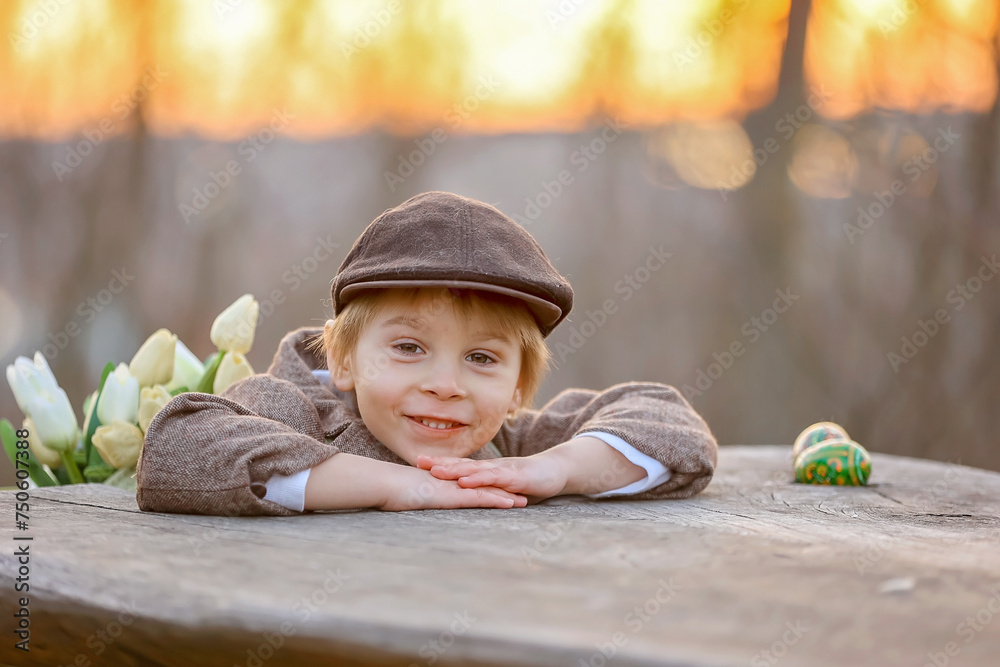 Beautiful stylish toddler child, boy, playing with Easter decoration in the park, springtime