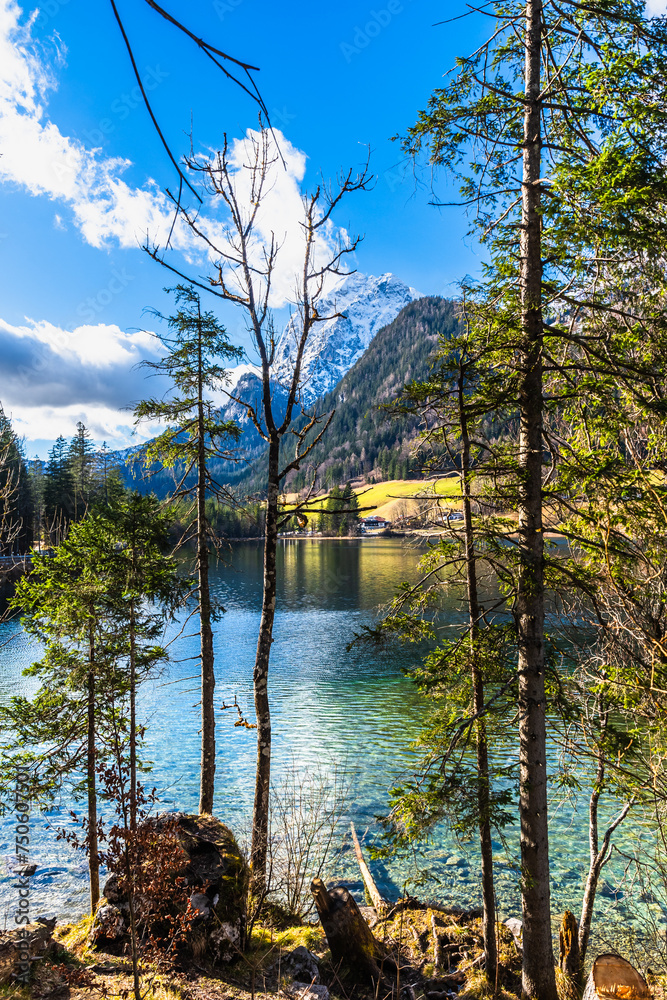 Lake Hintersee in Germany, Bavaria, Ramsau National Park in the Alps. Beautiful winter landscape.