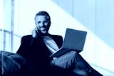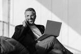 Cheerful businessman with laptop and phone in modern office setting with sunlight