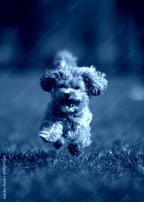 A beautiful small dog of the Maltipoo breed runs through a clearing with grass.