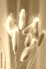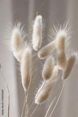 Detail of beautiful creamy dry grass bouquet. Bunny tail, Lagurus ovatus plant against soft blurred beige curtain background. Selective focus. Natural floral home decoration. Vertical.