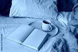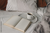 Cup of coffee, open books on white bed sheet. Breakfast in bed concept. Blurred muslin, linen pillows, blanket. Moody cozy Scandinavian bedroom. Top view, no people. Lifestyle banner.