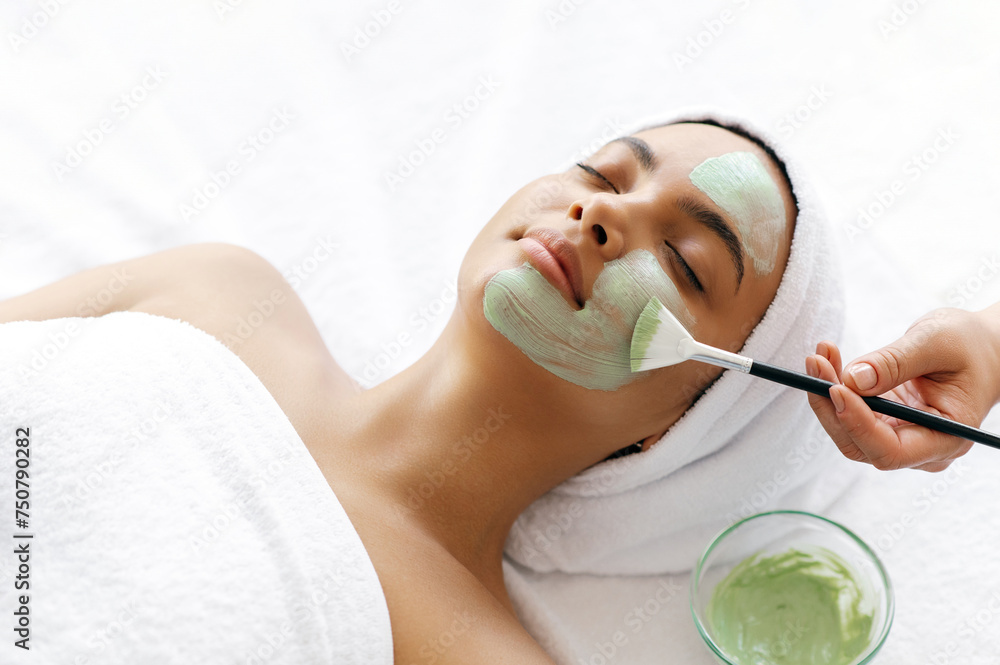 Procedure of applying a clay mask to the female face. Close-up of process of therapist applying green face mask on half face of a beautiful brazilian or hispanic young woman. Skincare concept