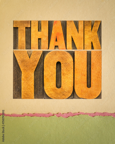 thank you, word abstract in vintage letterpress wood type on art paper, vertical poster