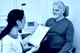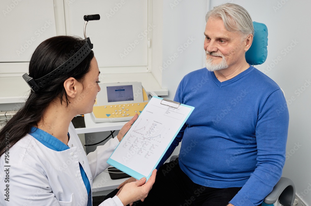 Experienced audiologist doing consultation for senior man patient with hear problems at audiology center. Hearing doctor's consultation