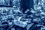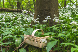 Freshly picked wild garlic in a wooden basket in the forest. Spring herbs. Vegan healthy cuisine.