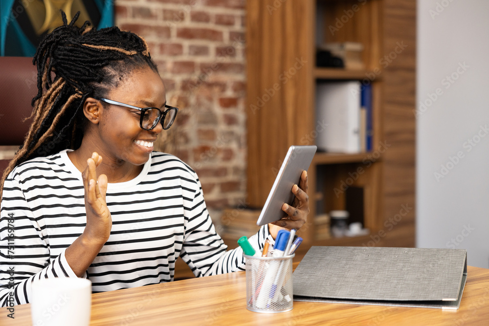 Smiling Afro American woman engaged in a video call while seated at her home office, showcasing modern daily living with technology and maintaining connections.