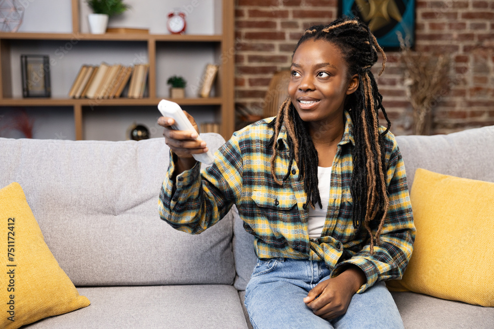 Content African American woman relaxing on couch, utilizing remote control for air con at a comfortable and stylish living room. Experiencing home comforts and smart living.