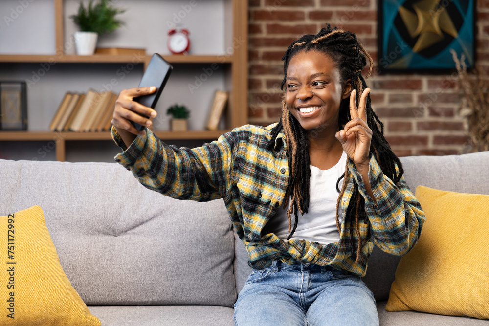 Woman Enjoying Video Call at Home. Joyful Afro American woman at home having a video call using smartphone. She smiles and makes a peace sign, showcasing comfort and happiness in a cozy living space.
