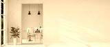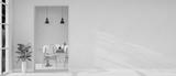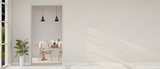 The interior design of a contemporary white home corridor through a dining room.