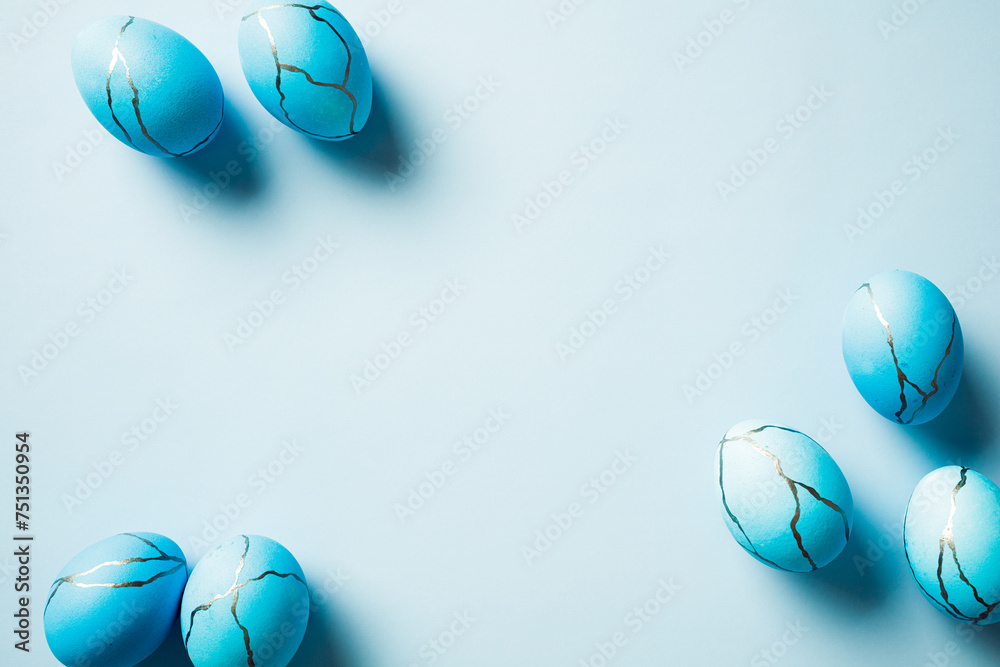 Easter eggs with marble stone effect on blue table. Easter background. Flat lay, top view.