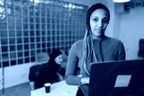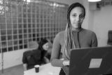 Successful young African American businesswoman standing in modern office holding laptop computer and confident looking to camera. Diverse businesspeople negotiating on blurred background on workplace