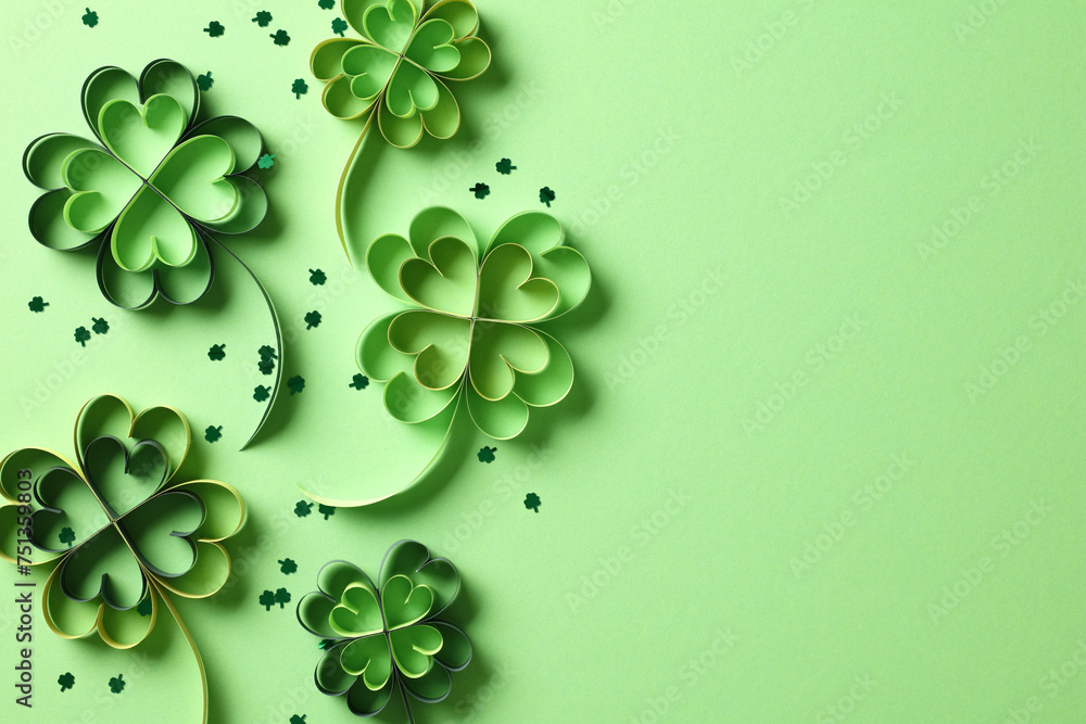 St Patricks day banner design. Top view paper cut four leaf clover with confetti on green background.