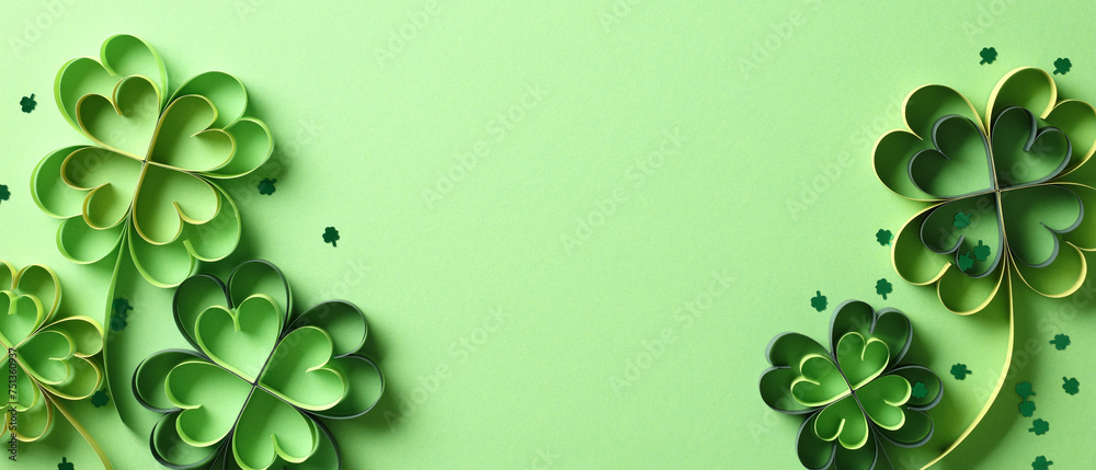 Paper cut four leaf clover with confetti on green background. St Patricks Day banner design.