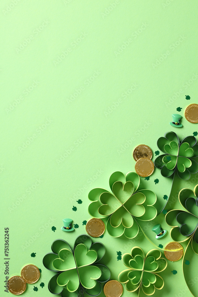 St Patricks Day banner design with four-leaf clover, gold coins, confetti.