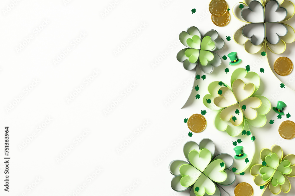 St. Patrick's Day greeting card with paper cut four leaf clover leaves on white background.