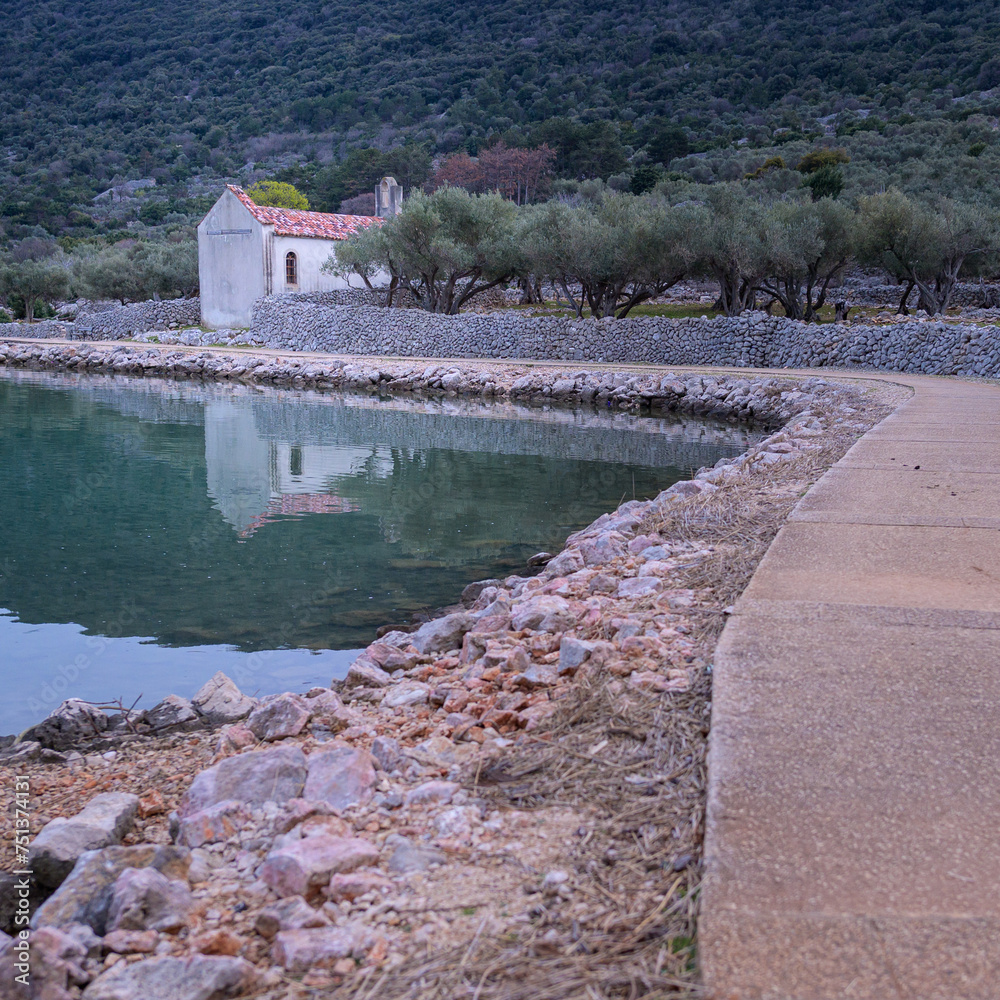 Path, chapel and calm sea near Cres after sunset in springtime