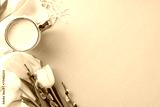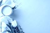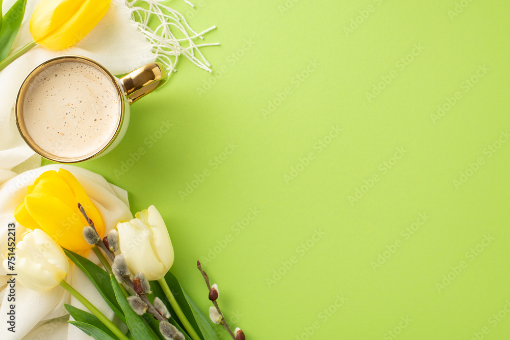 Spring's Arrival theme: Top view of frothy cappuccino, fresh tulips, pussy willow and warm scarf on pastel green surface, offering space for text or promos
