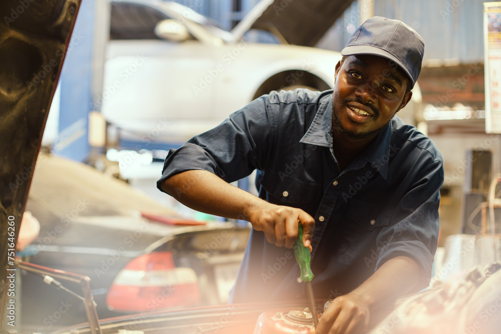 African auto mechanic inspects a car that has a problem with overheating causing smoke