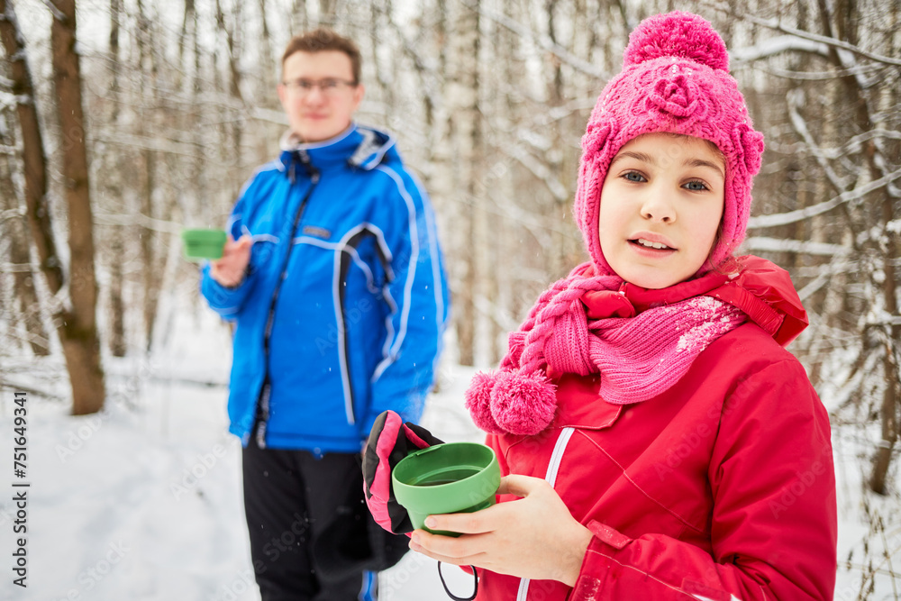 Young man in glasses and girl stand holding cups with hot tea in snowy park, focus on girl