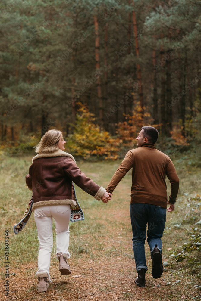 Adult couple having fun together in autumn park, a man and a woman are holding hands while running through the woods