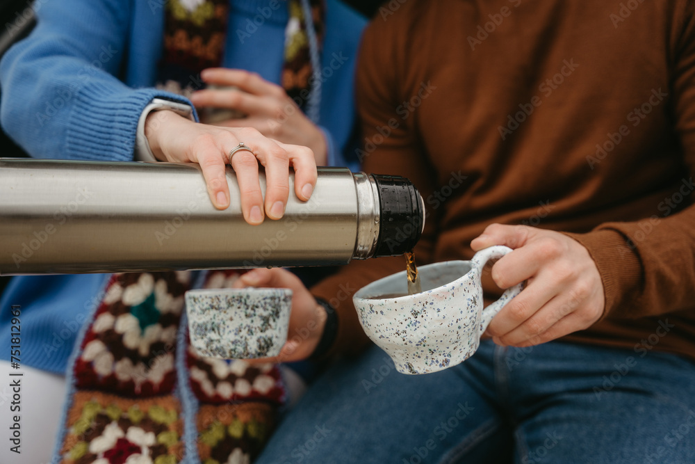 A man and woman drinking tea from thermos during autumn travel, couple holding handmade cups filled with warm drink