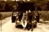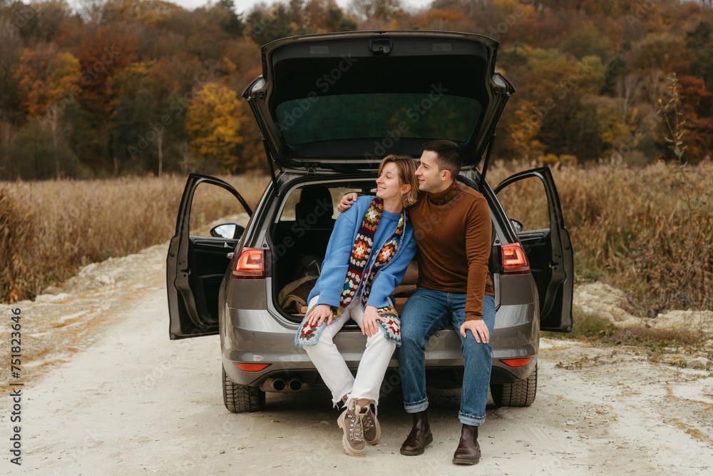 Happy young woman and man sitting in the open trunk of their car while traveling in autumn and looking away, couple road trip concept